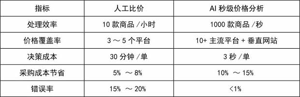 在数字化时代,人工比价的低效与AI秒级价格分析的高效形成了鲜明对比。