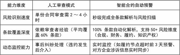 表1-3 合同风险难把控和智能合约自动预警的对比