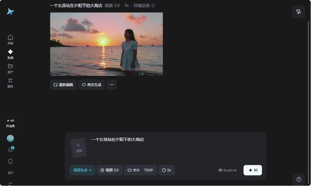 即梦AI是一款字节跳动旗下剪映团队研发的一站式智能创作平台,具有“以图生动”或“文字变视频”功能,适合想快速把文案转成视频场景的人使用。你可以输入一句话,如“一个女孩站在夕阳下的大海边”,即梦AI就能生成相应风格的动态画面,如图1-6所示。如果你有一段脚本,它还能根据剧情生成配图、配乐,甚至自动拼接段落,完成一段完整的视频。该平台非常适合做Vlog配景、情绪视频背景、短剧场景过渡等。