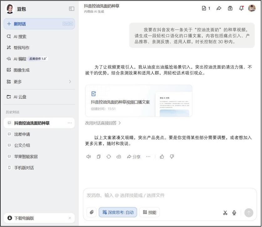 在短视频创作中,写文案是最基础也最费脑力的环节之一。一个吸睛的标题、一段顺畅的脚本,往往决定了观众是否愿意点进来、能否看下去。但灵感并不能时时都在,写作效率低、质量不稳,是很多创作者的共性难题。写文案类的AI工具,正是解决这些痛点的“智能助手”。它们可以帮助创作者快速生成标题、优化语言、搭建脚本结构,大大减轻内容策划的压力。例如,DeepSeek、ChatGPT、豆包等工具。