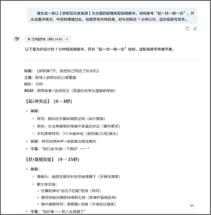 DeepSeek是一款国产AI创作工具,其中文理解能力强,尤其擅长结构化输出。你给它一个主题,它就能帮你一步步搭建出一个完整的短视频脚本,包括开头钩子、情绪反转和结尾落点,非常适合用在情绪类、剧情类内容上。如果你有大致想法但写不出结构,可以把内容交给DeepSeek进行后续创作,如图1-1所示。