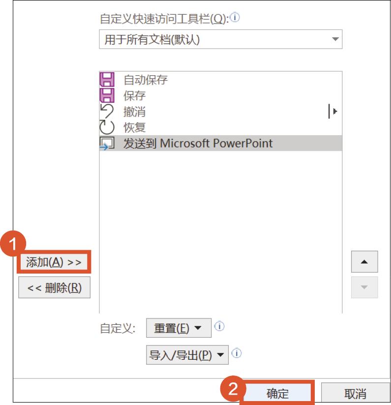 3 单击【添加】按钮,将命令添加到右侧的快速访问工具栏列表中,单击【确定】按钮。
