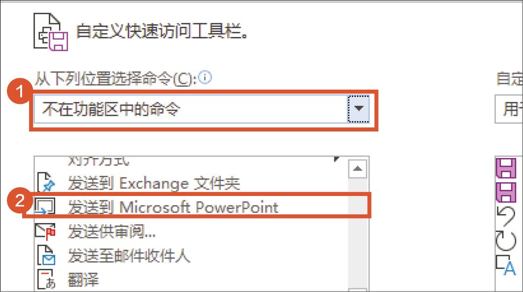 2 将【PowerPoint选项】对话框右侧默认的【常用命令】更改为【不在功能区中的命令】,在下方命令列表中找到并选中【发送到Microsoft PowerPoint】命令。