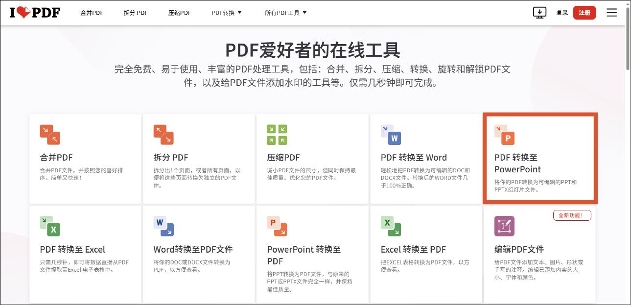 1 单击网站主页中的【PDF转换至PowerPoint】按钮。