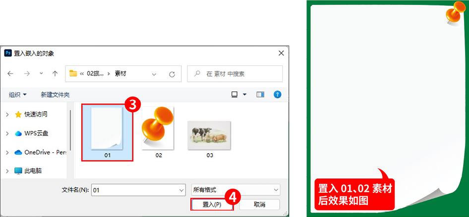 2 选择“文件 > 置入嵌入对象”命令,在弹出的对话框中选择01素材,再单击“置入”按钮,置入素材。使用相同的方法置入02素材,并将其拖曳到适当的位置。