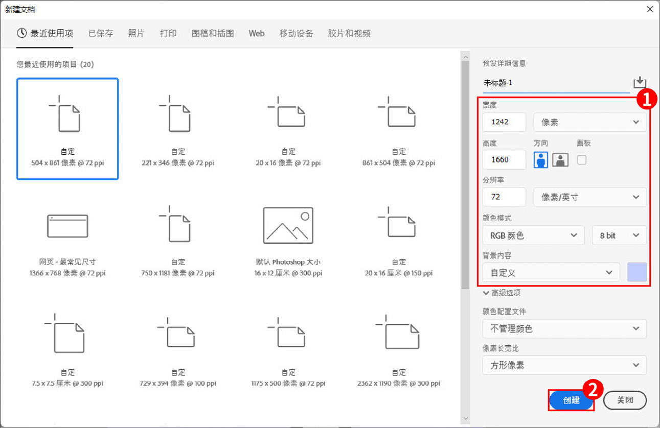 1 启动Photoshop,按Ctrl+N组合键,弹出“新建文档”对话框,设置宽度为1242像素,高度为1660像素,分辨率为72像素/英寸,颜色模式为RGB颜色,背景内容为淡紫色(193,205,254)。单击“创建”按钮,新建文档。