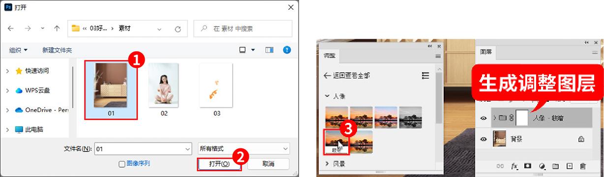 2 在“调整”面板中,单击“人像”选项组中的“较暗”,为图像调色并生成调整图层。