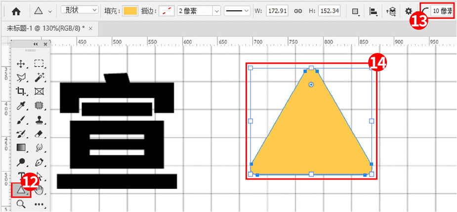 ,在属性栏中,将圆角的半径设置为10像素,然后在按住Shift键的同时绘制一个三角形。