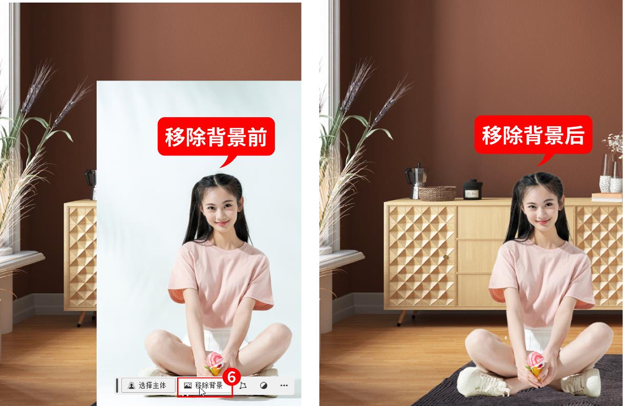 4 将其拖曳到适当的位置并调整大小。然后单击“移除背景”按钮,抠出人物。