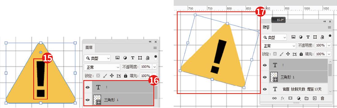 使用上述的方法输入需要的文字。在按住Shift键的同时,在“图层”面板中单击“三角形1”图层,同时选取两个图层。按Ctrl+T组合键,将鼠标指针放在右上角的顶点外缘,指针变为