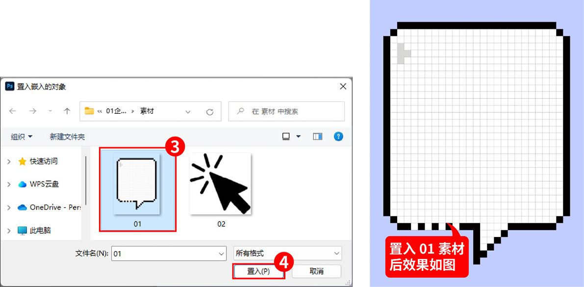 2 选择“文件 > 置入嵌入对象”命令,在弹出的对话框中选择01素材,再单击“置入”按钮,置入素材。