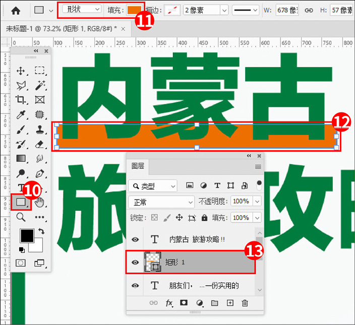 ,在属性栏的“选择工具模式”选项中选择“形状”,将填充颜色设置为橙色(237,111,0),然后绘制一个矩形。在“图层”面板中将“矩形1”图层拖曳到文字图层的下方。