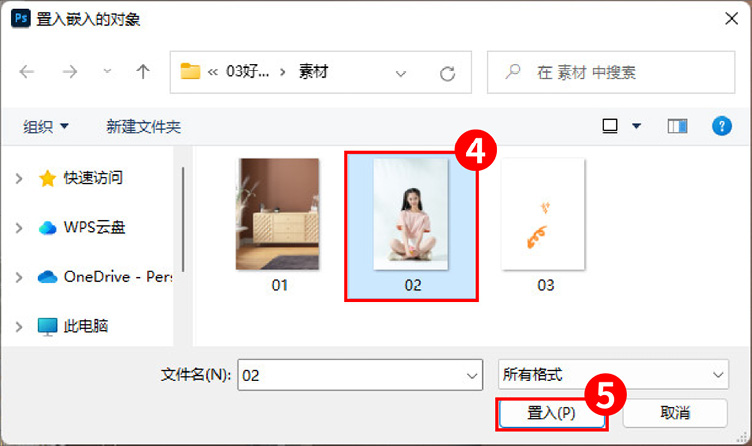 3 选择“文件 > 置入嵌入对象”命令,在弹出的对话框中选择02素材,再单击“置入”按钮,置入素材。