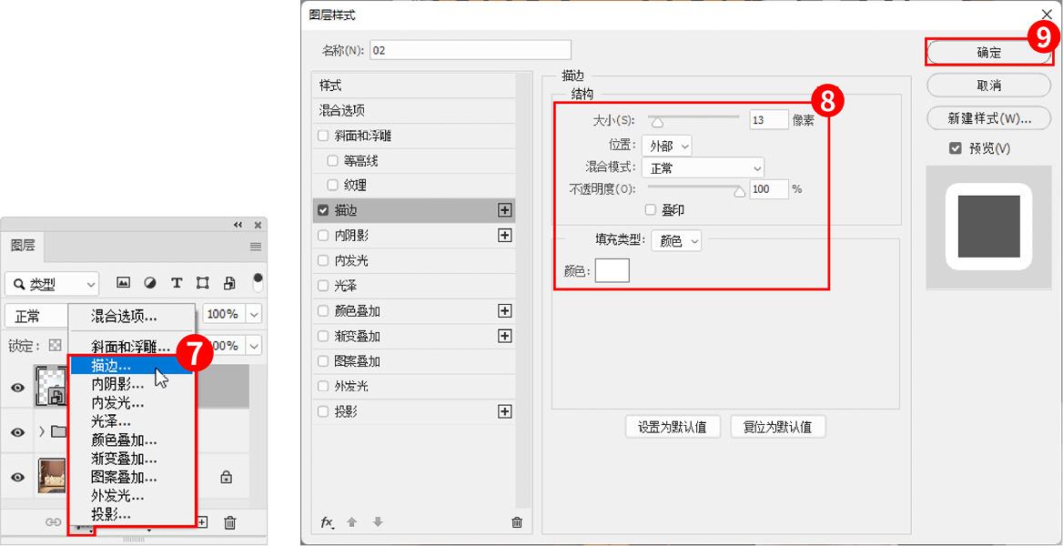 ,选择“描边”命令,在弹出的对话框中将描边颜色设置为白色,其他选项的设置如图所示,然后单击“确定”按钮。