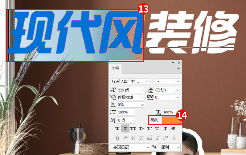 ,在图像窗口中输入需要的文字。在“字符”面板中设置文字为白色,并选择合适的字体和字号。选择需要的文字,在“字符”面板中设置文字为橘黄色(255,141,41)。