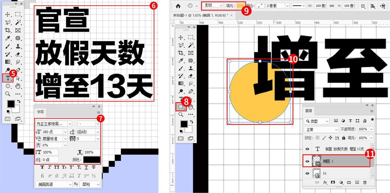 ,在属性栏的“选择工具模式”选项中选择“形状”,将填充颜色设置为橙黄色(255,202,76),然后在按住Shift键的同时绘制一个圆形。在“图层”面板中将“椭圆1”图层拖曳到文字图层的下方。