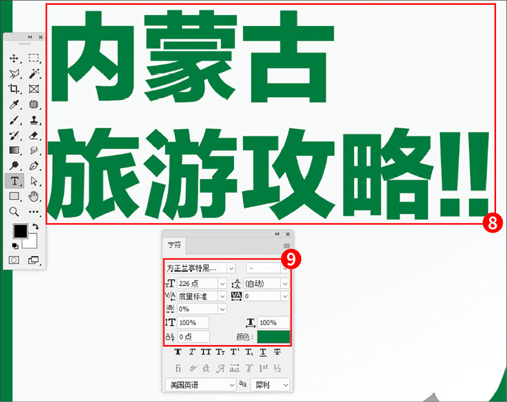 4 再次输入文字,在“字符”面板中设置文字为深绿色(0,125,62),并选择合适的字体和字号。