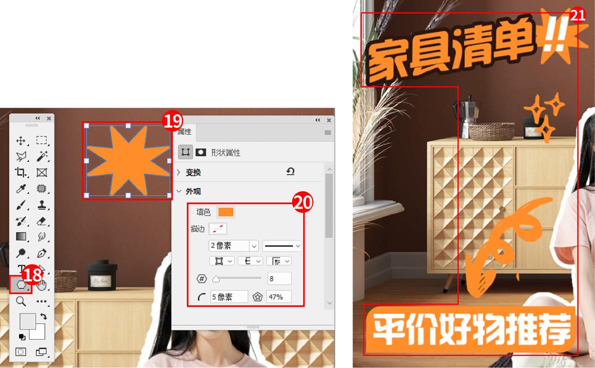 ,绘制一个多边形。在“属性”面板中,将填色设置为橘黄色(255,141,41),边数设置为8,圆角的半径设置为10像素,星形比例设置为47%。