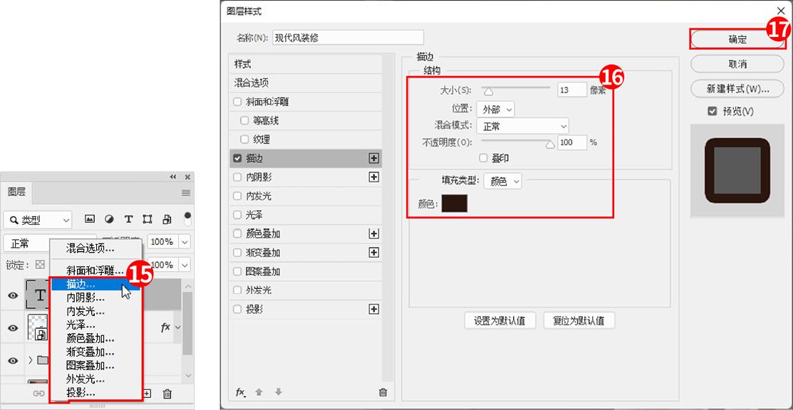 ,选择“描边”命令,在弹出的对话框中将描边颜色设置为枣红色(43,22,15),其他选项的设置如图所示,然后单击“确定”按钮。