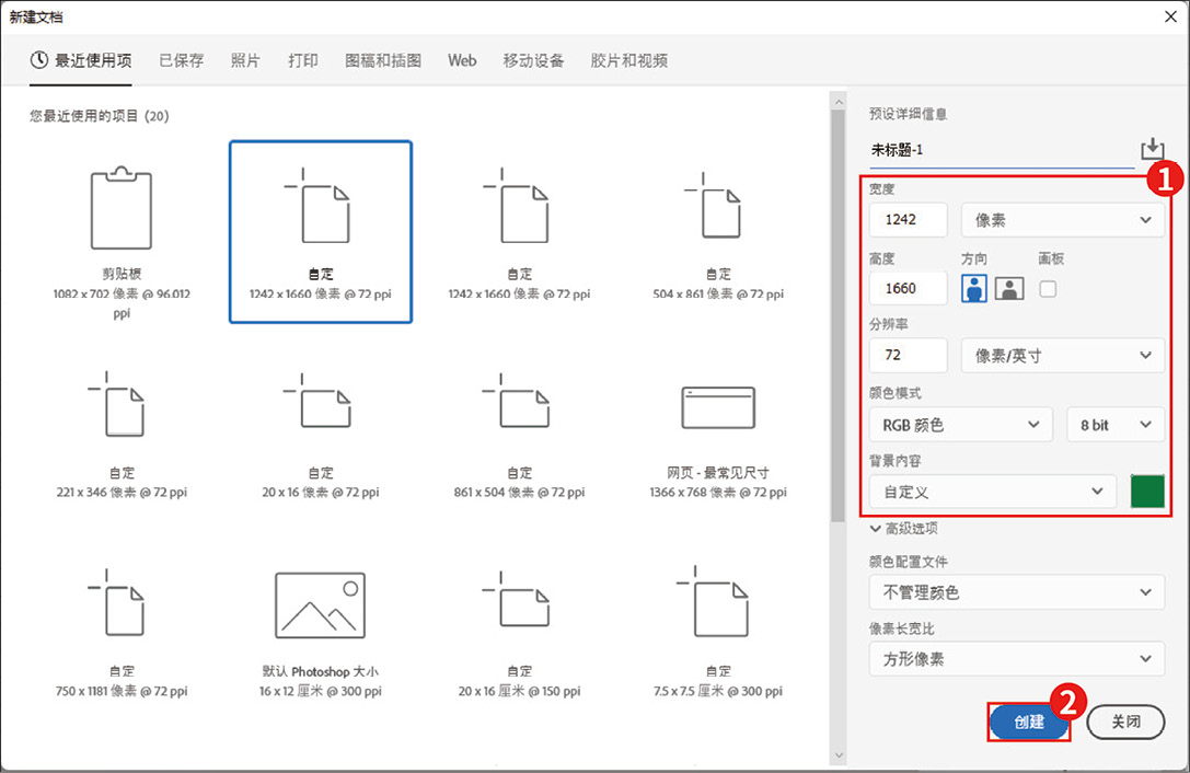 1 启动Photoshop,按Ctrl+N组合键,弹出“新建文档”对话框,设置宽度为1242像素,高度为1660像素,分辨率为72像素/英寸,颜色模式为RGB颜色,背景内容为深绿色(0,125,62)。单击“创建”按钮,新建文档。