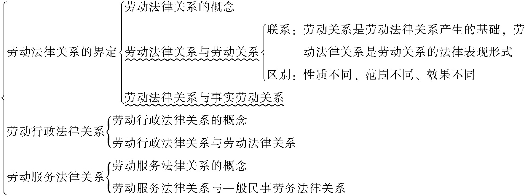 3. 劳动法律关系与事实劳动关系 。事实劳动关系,是指虽然在劳动法调整范围内但不符合法定模式的劳动关系。劳动法律关系和事实劳动关系尽管都在劳动法调整范围内,但二者具有不同的法律属性,主要表现在: