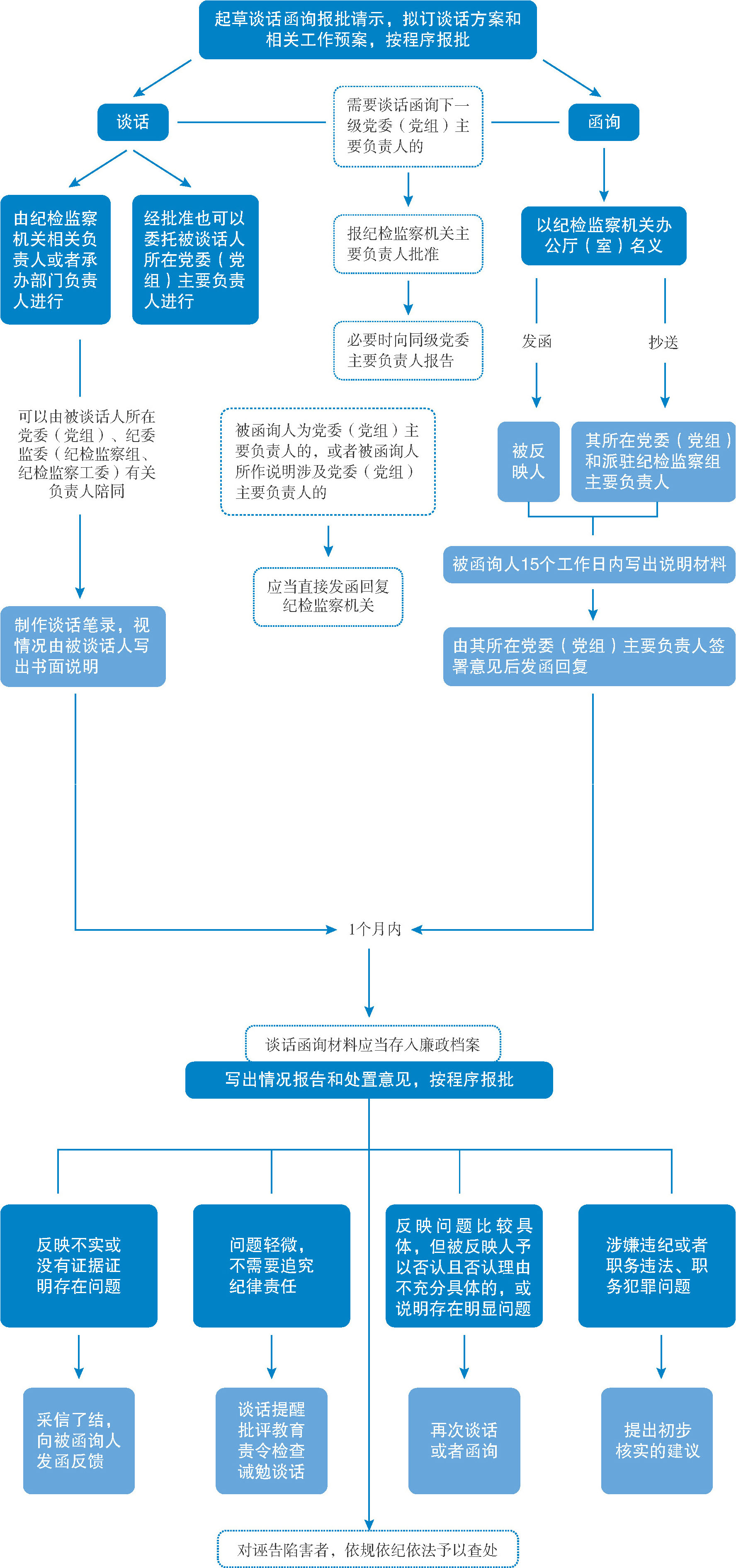 (三) 反映问题比较具体 ,但被反映人予以否认且否认理由不充分具体的,或者说明存在明显问题的,一般应当再次谈话或者函询;发现被反映人涉嫌违纪或者职务违法、职务犯罪问题需要追究纪律和法律责任的,应当提出初步核实的建议。
