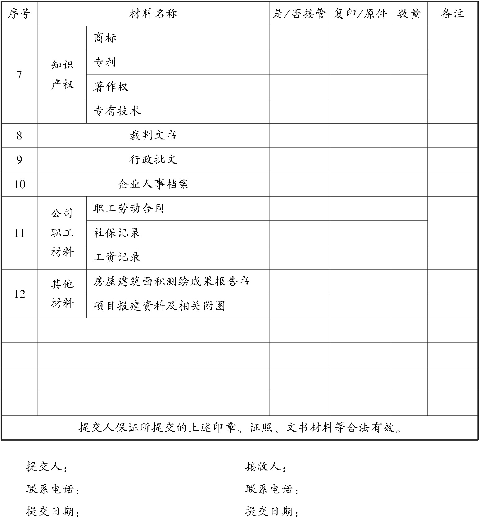 包括但不限于法人营业执照、分公司营业执照、税务登记证、企业代码证、经营许可证、报关证、法定代表人登记证、贷款证、企业信用等级证(包括正副本和电子文本)等。债务人的法定代表人(或保管人)和管理人接管人员在证照移交清单上签字确认,该移交清单交一份予法定代表人(或保管人)留底。
