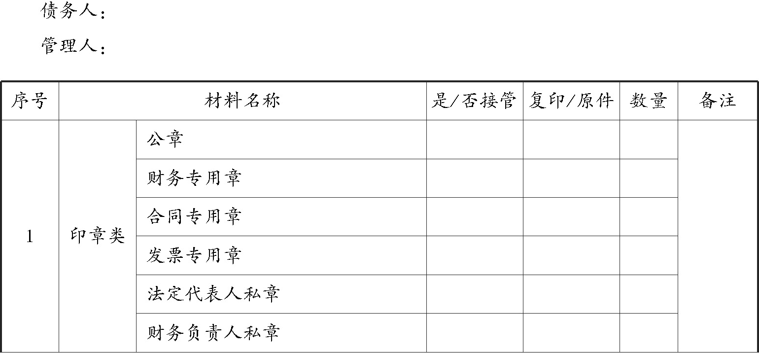 管理人应通知债务人的法定代表人收集整理全部印章,在管理人及法定代表人或保管人的共同见证下用印章在A4空白纸上按顺序盖上印样并逐一编号。移交后,由法定代表人(或保管人)和管理人小组接管人员在移交清单上签字确认,该移交清单交一份予法定代表人(或保管人)留底。此外,管理人还应到工商行政管理部门及公安机关提取债务人印章登记备案的印样,核对一致性。