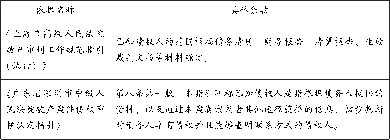 表6 部分地区法院出台的如何确定已知债权人的法律依据