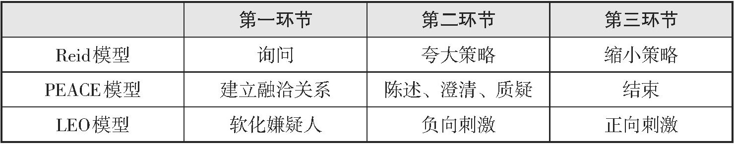 本书第五章对域外经典侦讯模型的技术特征进行了详细分析,发现无论是美国的Reid侦讯模型,还是LEO侦讯模型,抑或英国的PEACE侦查访谈模型,都基本包含三个技术环节(见表2-1)。现有文献资料都强调第一个技术环节的重要性,承认第二个技术环节的核心性,并指出第三个技术环节需要特别耐心和谨慎。