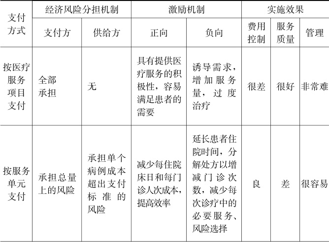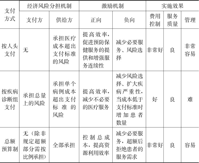 表1-1 不同医保支付方式的经济风险分担机制、激励机制与实施效果比较