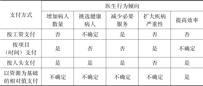 从微观经济学理论角度分析,不同的医保支付方式会形成不同的风险分担机制和激励机制,从而直接影响医疗服务提供者的行为和医保组织目标的实现,故而这一直是学术界关注的重点。具体内容参见表1-1。