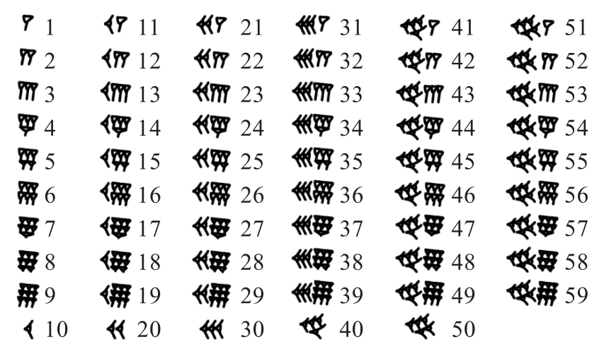 古巴比伦人的记数系统是六十进制,60以内的数用简单累加制。所谓“累加制”,是同一单位用同一符号累加,达到较高单位时才换一个新符号。楔形数字1~59如图2-9所示。