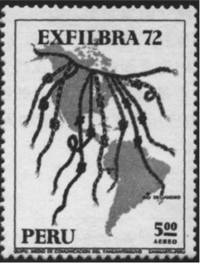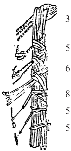 人类结绳记数或记事的遗风,可以从近代一些边远地区的实物中得到证实。例如,在印加文明所在地秘鲁发现的“奇普”(见图2-1),其中绳结的扭转次数代表数字,单结代表某个大数,结在左边就表示“出库”或者“支付”,结在右边就表示“入库”或者“收入”,这算是一种基本的“结绳记数”。而在琉球群岛也曾呈现一种类似“奇普”的苇草记事绳把(见图2-2),岛上的工人将稻草或者芦苇编织成绳结状,并用不同形式的麦穗表示工资。每种穗饰都表示一个特定的价值单位,每个穗饰的位置不同,因此它们一起组成了一种位置值表示法。一个自由端代表一个单元,一个结代表五个单元。