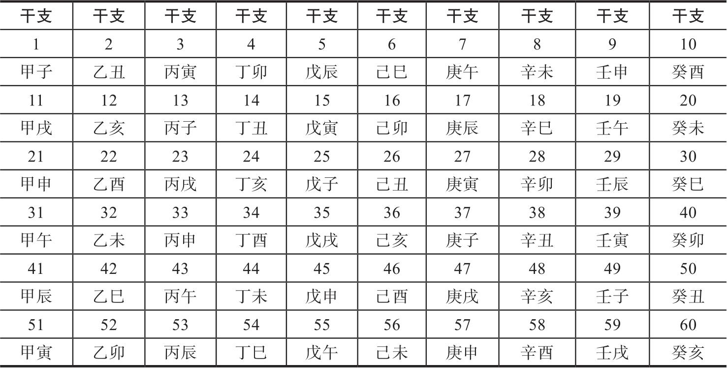 干支记数法是中国古代特有的序数记数方法,并且沿用至今。它是一种特有的六十进制的记数方法。干,就是十天干:甲、乙、丙、丁、戊、己、庚、辛、壬、癸。支,是指十二地支:子、丑、寅、卯、辰、巳、午、未、申、酉、戌、亥。将10个天干和12个地支搭配起来,成为甲子、乙丑、……、癸亥,共60个不同的干支名,称为六十甲子(见表2-1)。