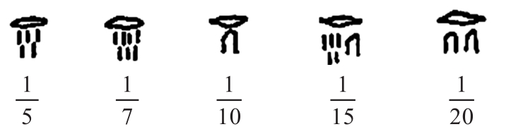 在古埃及已经有了分数,但除去几个特殊的分数有单独记法外,其余都是单分数,即分子是1的分数,也称单位分数(见图2-11),其他分数都化为单位分数来进行计算。