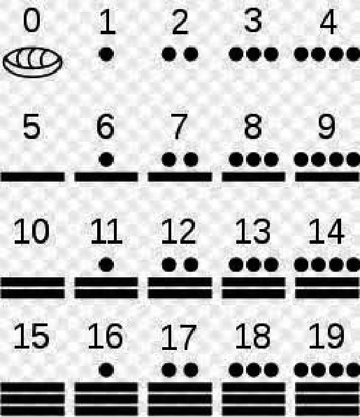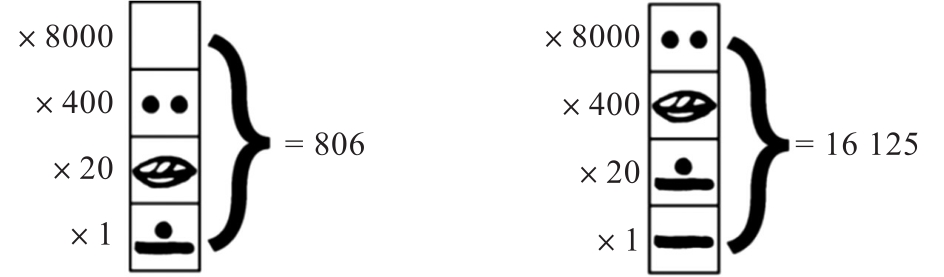 玛雅文明起源于约公元前10世纪,覆灭于约公元16世纪。古代玛雅人的数系是16世纪在墨西哥被发现的。玛雅文明一直披着神秘的外衣,直到近些年来,玛雅石碑上书写的符号才逐渐开始被解读。玛雅人记数系统是二十进制,20以内的数也是采用简单累加制。研究认为法定的玛雅年是360天,因此其数系本质上是二十进制。古代玛雅数字(见图2-13)仅用三个符号就组成了所有数字,这三个符号为:贝壳符号(0)、点符号(1)、横线符号(5)。玛雅人用这三个符号就可以演变出数字0~19。例如,将19写作3道横线上另加4个点。大于19的数字以20为权累进,任何数的下方加一个贝壳,就表示这个数扩大到20倍。例如,20就写作一个点(代表20),下加一个贝壳形;而33写作一个点,下加一个13(3个点+两道横线)。古代玛雅人没有计算符号,其数字是自上而下排列的,图2-14是806与16125的玛雅记法: