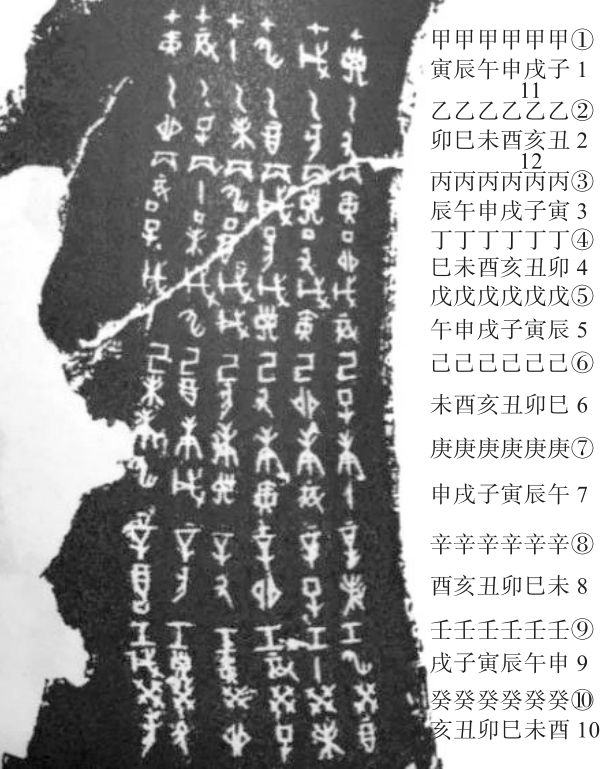 在中国的历史上,夏代帝王中已有孔甲、履癸等带有天干的名字,商代各帝王的名字中第二个字也是天干中的某一个“干”字,如盘庚、武丁、祖甲、太丁、帝乙、帝辛等。帝辛就是殷纣王的名字。这表明十天干先于十二地支出现。在商代的甲骨文中出现了大量较为完整的干支表(见图2-8),这些干支表尽管都有些残损,但从排列上看,全是由上到下竖行排列,而且都是甲起头,10对一行,排列整齐,这说明商代人已有了60对干支一循环的序数概念。