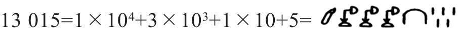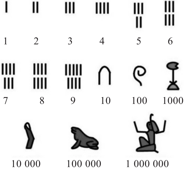 古埃及象形文字的数系不是位值制,该记数系统中的每个数字都由一组符号决定,其数值与所在数字中的位置无关。古埃及象形数字如图2-10所示。古埃及人用形如“轭”的符号来表示10,用一圈绳子表示100,用一枚莲花表示1000,用一个指头表示10000,用一只青蛙表示100000,用举起双臂端坐着的神祇形象来表示1000000。任何数都可以用这些符号相加的方法来表示,其中每一个符号重复必要的次数。例如,13015用古埃及象形数字表示为