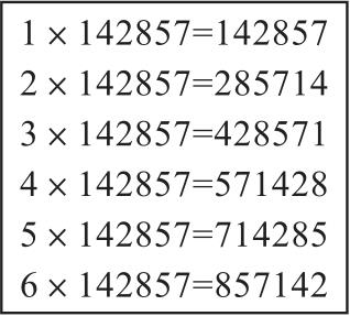 “142857”这串数字出自古埃及的金字塔。有着“世界七大奇迹”之一美称的金字塔,同时也是当今世界上最为神秘的建筑之一,一直给世界带来不少令人惊奇的宝藏。金字塔留给人们很多神奇的未解之谜,比如142857,它又被称为“走马灯数”。如果我们将“142857”分别和1~6的数字相乘,神奇的事情就发生了,如图2-24所示。就像走马灯中“人骑着马的图像反复地出现在人们的视野中”那样,“1,4,2,8,5,7”这六个数字也反复规律地出现,这一发现着实令人惊叹不已。当我们继续进行乘法运算,将这个数字与7相乘时,一件神奇的事情发生了:142857×7=999999。在中国的传统中,我们对“9”这个数字有着非常特殊的解释——人们常说“九九归一”。这一理念与数字142857的乘法规律不谋而合:一个星期有七天,当将142857自我累加(通过与1~7相乘)时,前六天得到的是六个数字的组合,而到了第七天,结果就是999999,即数字142857前六天都“上班”,只有第七天休息,其他的数字“放假”,每个星期一个轮回。如果仔细研究,还会发现很多有趣的事情。例如,369并不在这个神奇的数组之中。如果说,142857是我们三维世界中最神奇的数字,那么369或许是通往更高维度的钥匙!