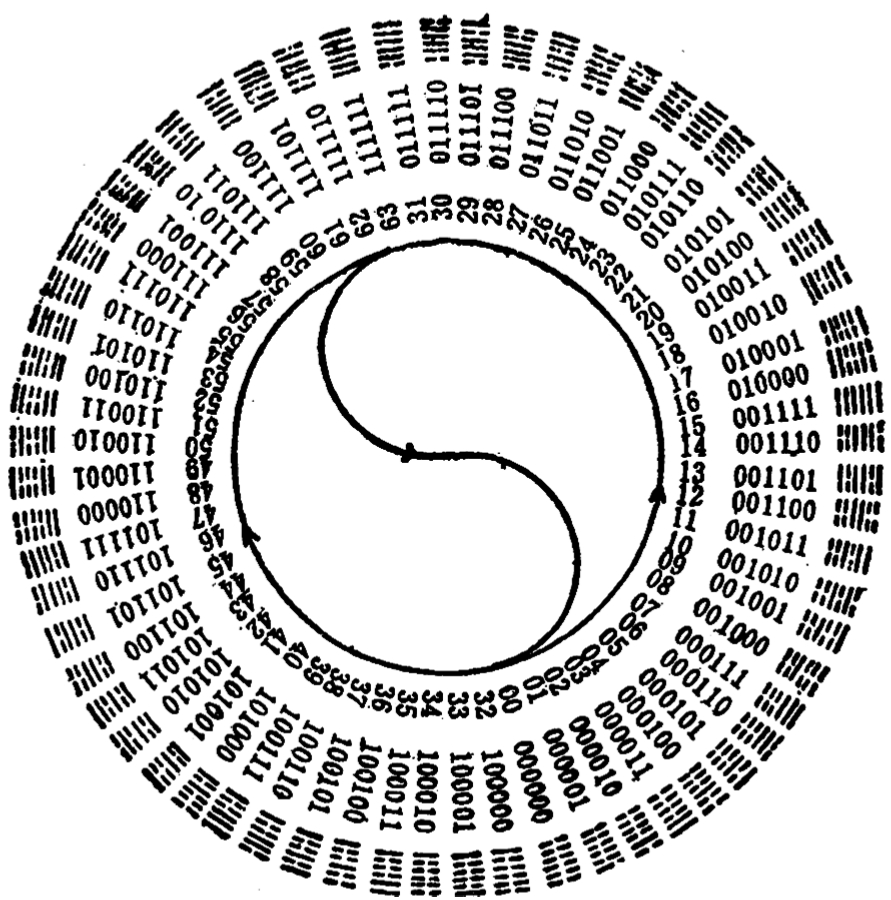一个有趣的事是,17世纪的德国数学家莱布尼茨在发明了二进制数之后,曾尝试用二进制数对中国的六十四别卦做出解释。大约在17世纪70年代,莱布尼茨发明了二进制算术,给出了用0,1表示的二进制数,并规定了二进制数改写为十进制数的法则,以及二进制数的加法、乘法与除法运算法则。1701年,在中国传教的法国传教士白晋将宋代邵雍绘制的六十四别卦图送给了莱布尼茨。莱布尼茨惊奇地发现,古老的易图可以解释成0至63的二进制数表。此后,莱布尼茨在1703年完成了论文“关于仅用0与1两个记号的二进制算术的说明,并附其应用以及据此解释中国古代伏羲图”。图2-22是宋代邵雍六十四卦圆图的二进制数译图
