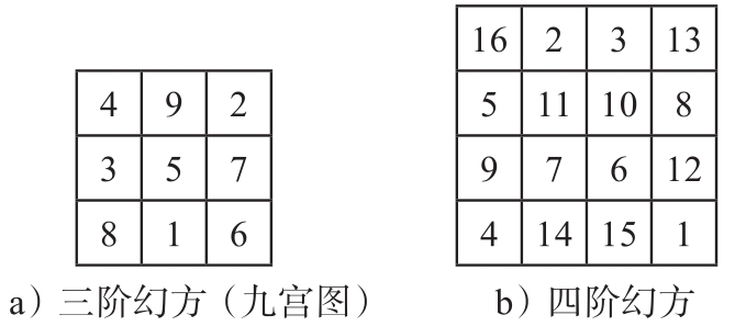 洛书上的数字常常用九宫图表示(见图2-19a),有时又称为数字幻方,或幻方,自古以来也是人们娱乐或研究的游戏。古人曾用诗歌描述九宫的数字规律:“四海三山八洞仙,九龙五子一枝莲;二七六郎赏月半,周围十五月团圆。”而在金庸小说《射雕英雄传》中也有一段情节: