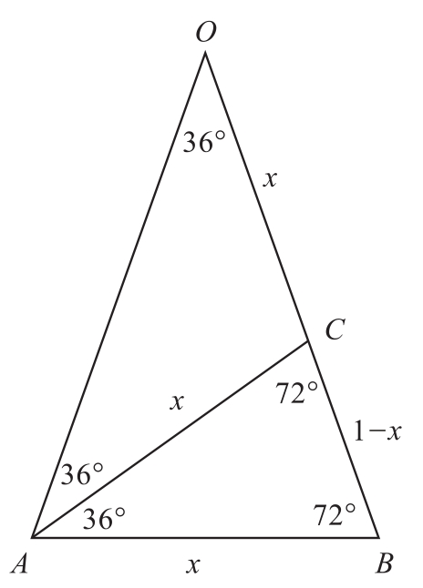 在古希腊几何学家试图构造正五边形时,也曾遇到过另一个有趣的无理数——黄金分割数。要作出正五边形,只要能构造出36°的角即可,因为这个角的二倍(即72°的角)正好是圆内接正五边形一边所对的圆心角。于是问题转化为构造顶角为36°的等腰三角形。如图3-6所示,设