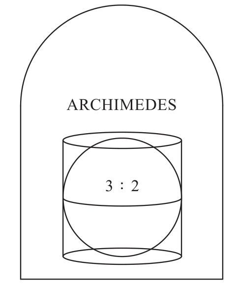 得知阿基米德死后,罗马军官马塞拉斯痛心疾首,他严肃处理了杀害阿基米德的士兵,亲自在西西里岛为阿基米德举行葬礼、修墓立碑。在阿基米德的墓碑上,马塞拉斯刻上了阿基米德一生最满意的作品——一个球内切于圆柱的图案(见图3-19),聊表敬仰之情。图案上镶嵌着“3∶2”以纪念阿基米德在几何上的伟大发现——圆柱体的表面积:球的表面积=圆柱体的体积:球的体积=3∶2。历史上,阿基米德的墓长期未被人发现,直到1965年,当地的一家旅馆在挖地基时,意外地发现了这个墓碑。