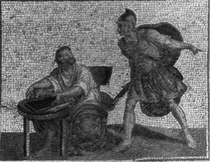 马其顿帝国建立不久,很快就受到了罗马人的威胁。在阿基米德生活的时代,双方争夺领地的战争频频不断。在反对罗马人的战争中,阿基米德制造各种机器和仪器,用于国家的防御。利用阿基米德的创造,叙拉古与罗马人对峙了大约两年时间。叙古拉陷落时,传说阿基米德正在聚精会神地思考几何问题。当罗马士兵跑到他跟前时,他说:“走开,不要动我的图。”恼怒的罗马士兵刺死了阿基米德(见图3-18)。