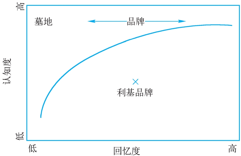 图1-5表明了回忆相对于认知的作用,该图描述的是一个“墓地模型”,是欧洲扬罗必凯广告公司在吉姆·威廉斯的指导下开发出来的。在这一模型下,一类产品中的品牌被列在一个标明认知度和回忆度的图上。例如,有20个汽车品牌,每一品牌的认知度和回忆度都可以被测量出来,测量数值为每个品牌在图上做了定位。通过对多类产品的研究表明,品牌倾向于按照图中显示的曲线分布。但存在两种例外情况,它们都反映了回忆的重要性。