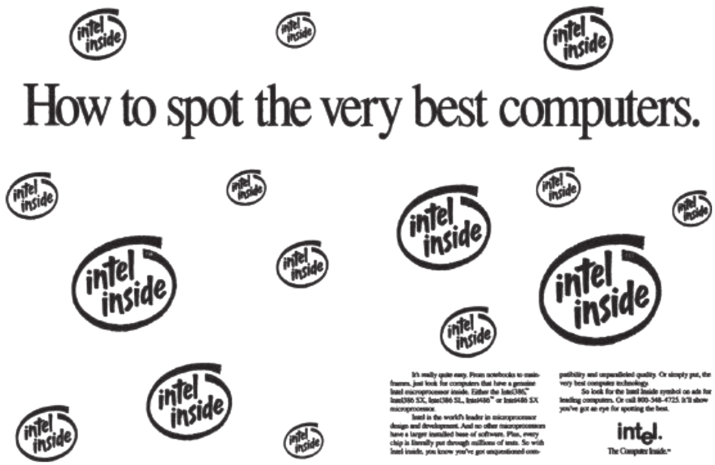 1991年,英特尔做出了反应,鼓励IBM、康柏、捷威和戴尔等电脑公司把“Intel Inside”标志用在其产品广告上。条件是英特尔支付这些公司部分广告费用,费用金额为这些公司售出的包含英特尔产品的商品的3%的销售额(如果这些公司在包装上也使用该标志,则是5%)。Intel Inside广告,如图1-4所示。
