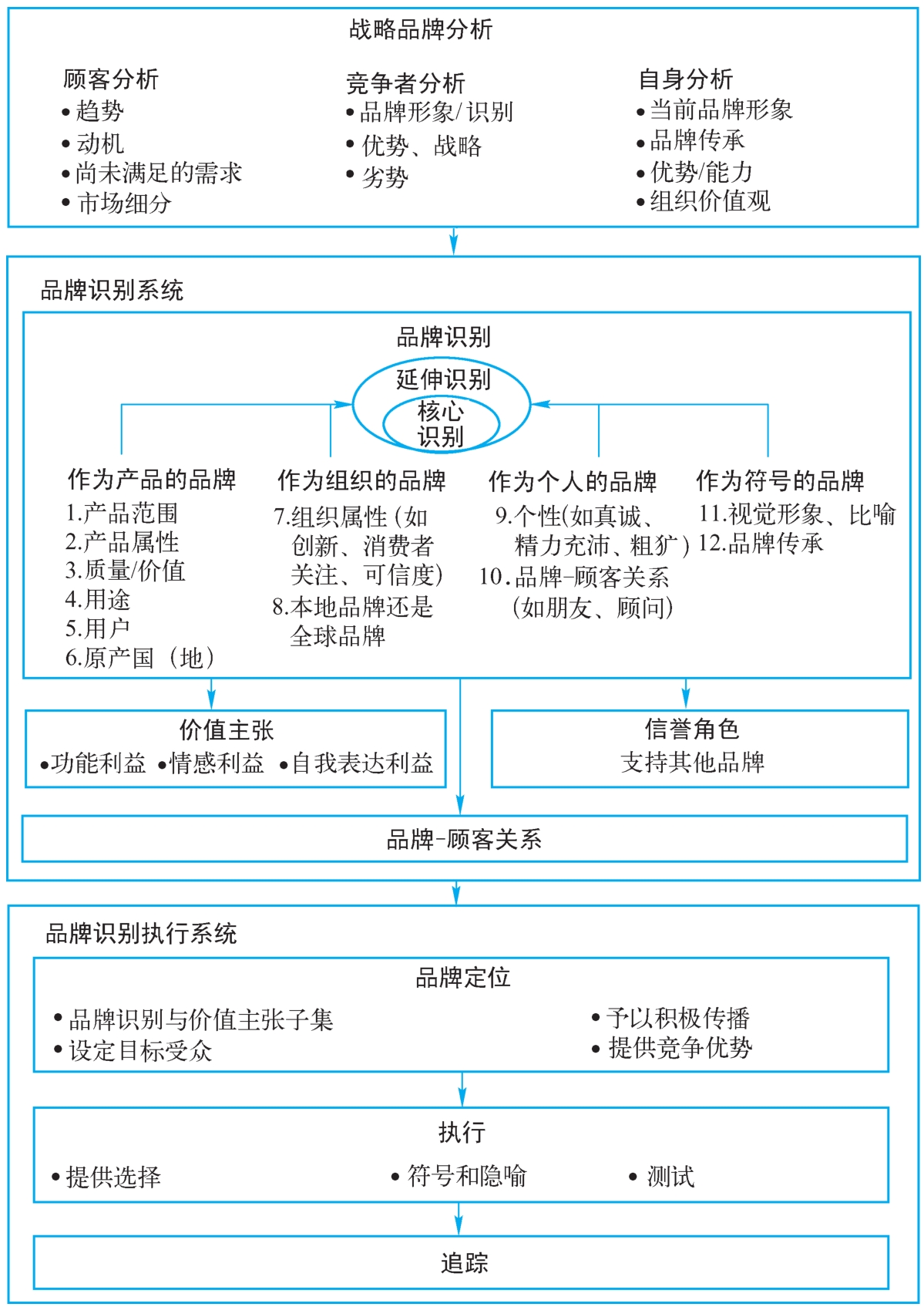 图3-3还纳入了另外两个主要内容:战略品牌分析和品牌识别执行系统。这两部分内容将在第6章中详细阐述。战略品牌分析包括对顾客、竞争者和自身的分析,从而为计划模型提供必要的信息来源。执行系统包括品牌定位(从品牌识别和价值主张中提炼的传播目标)、执行和追踪子系统。