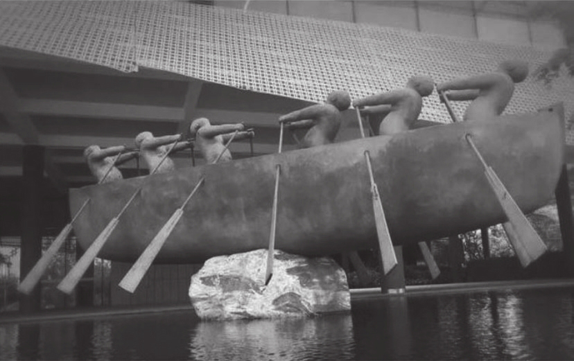 船上的每个人看起来都在拼尽全力地划船,然而,他们是在拼命地朝着相反方向划。这尊雕塑多么形象而生动。阿里巴巴把这尊雕塑放在园区,借以警醒每个管理者和员工,团队合作是多么重要,没有它,再大的努力也是徒劳。