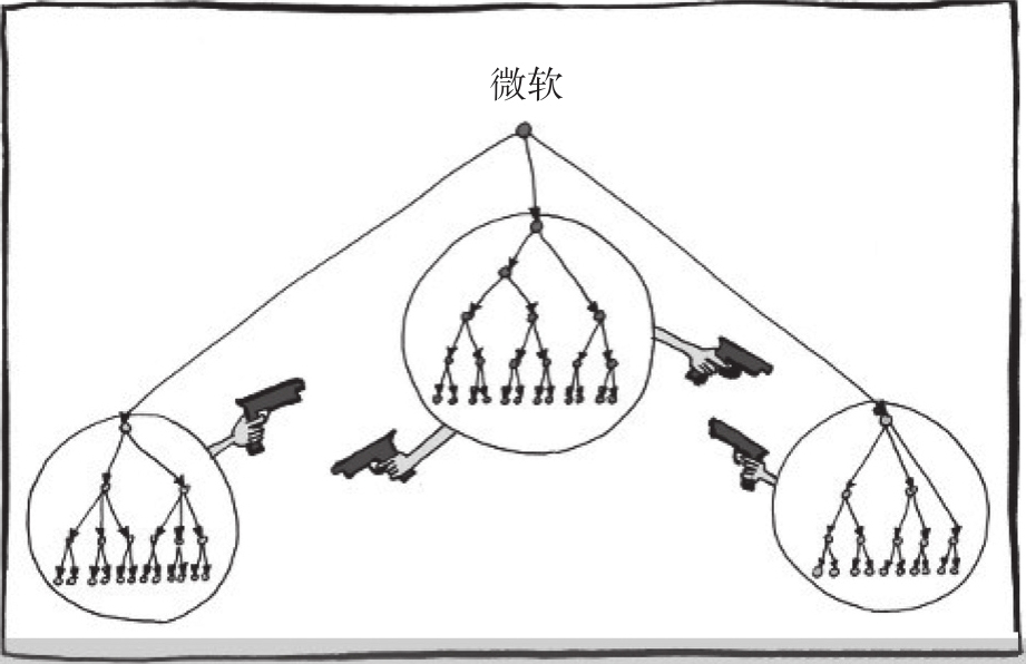 曾经实行这一制度的微软,在网络上广泛流传着一张描述其内部部门间氛围的组织结构图,如图2-3所示。